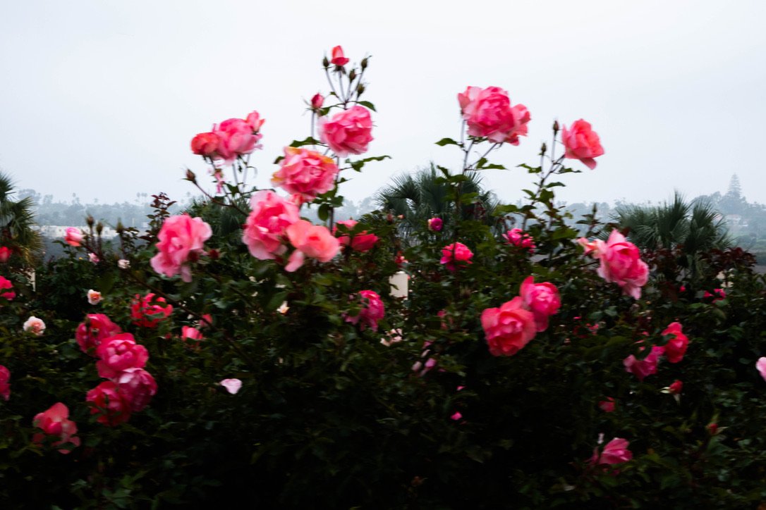 Pink and red roses blooming in a garden with an overcast sky