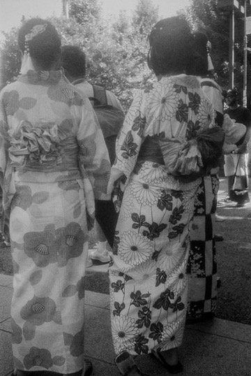 Two women wearing traditional kimonos with floral and butterfly patterns, standing outdoors with other people in the background.