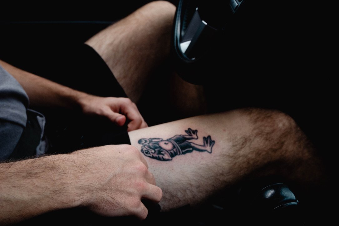A person with a tattoo of a cartoonish dog on their leg, sitting in a car.