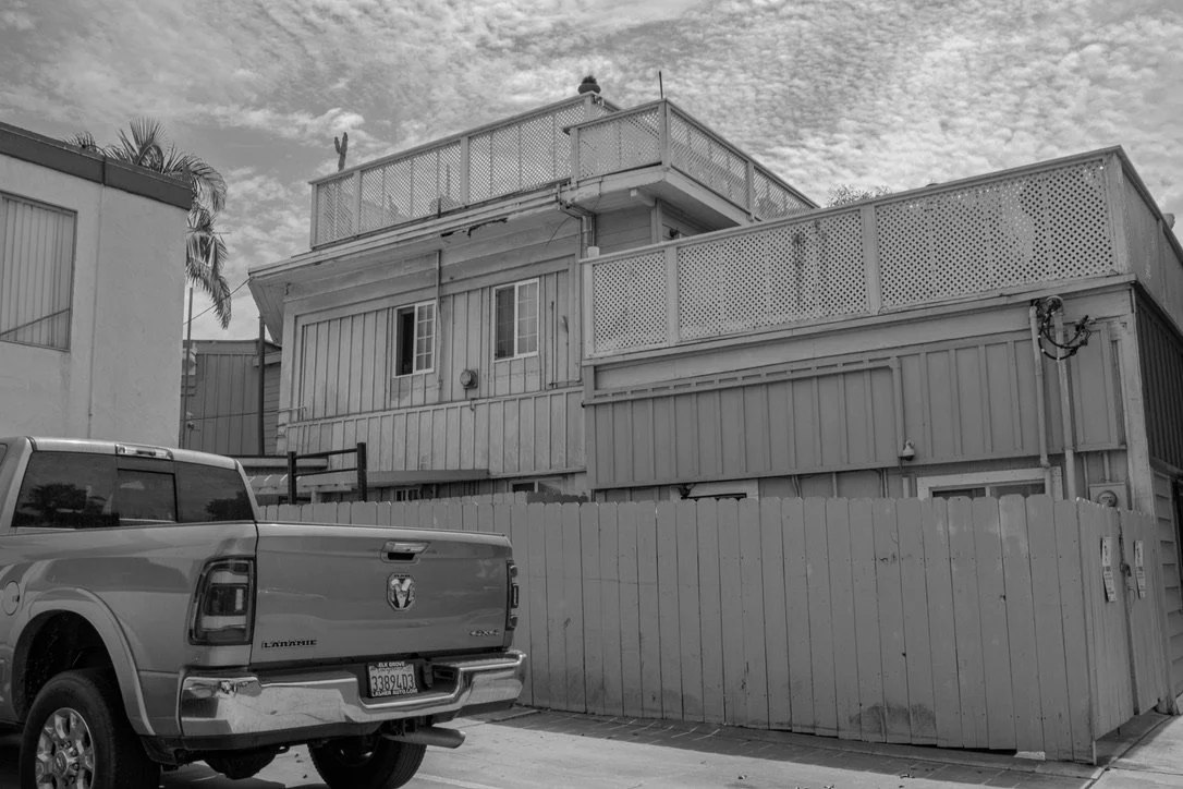 A black and white photo of a two-story house with a rooftop deck, a fence, and a parked pickup truck.
