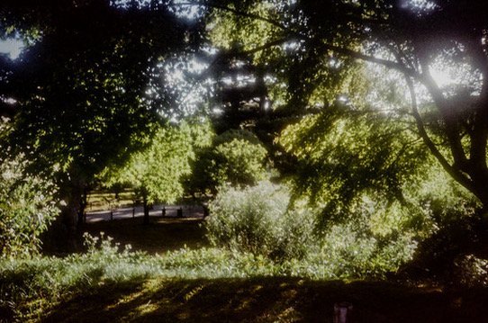 Sunlight filtering through green trees in a park or forest area.