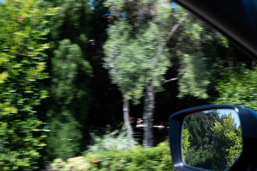 A blurry photo of a wooded area taken from a car window, with trees and greenery visible outside and in the side mirror.