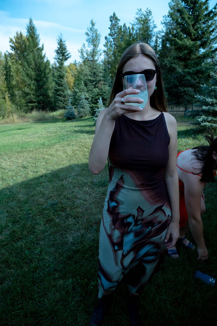 A woman wearing sunglasses and a sleeveless dress is holding a glass of water in front of her face outdoors in a grassy area with trees in the background.