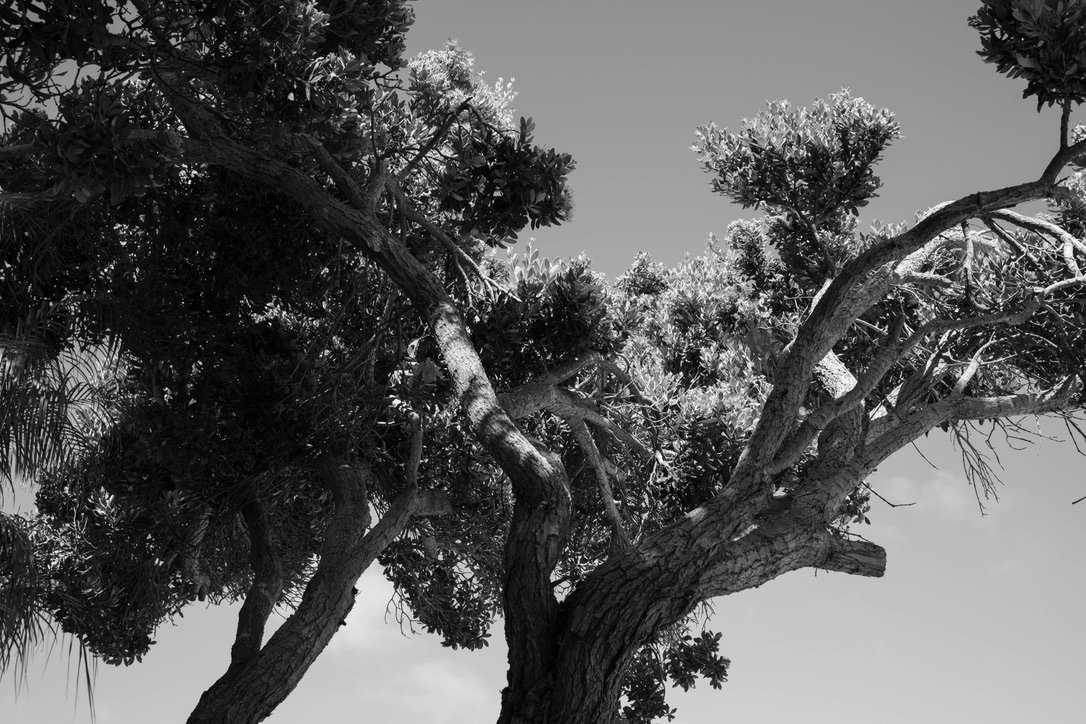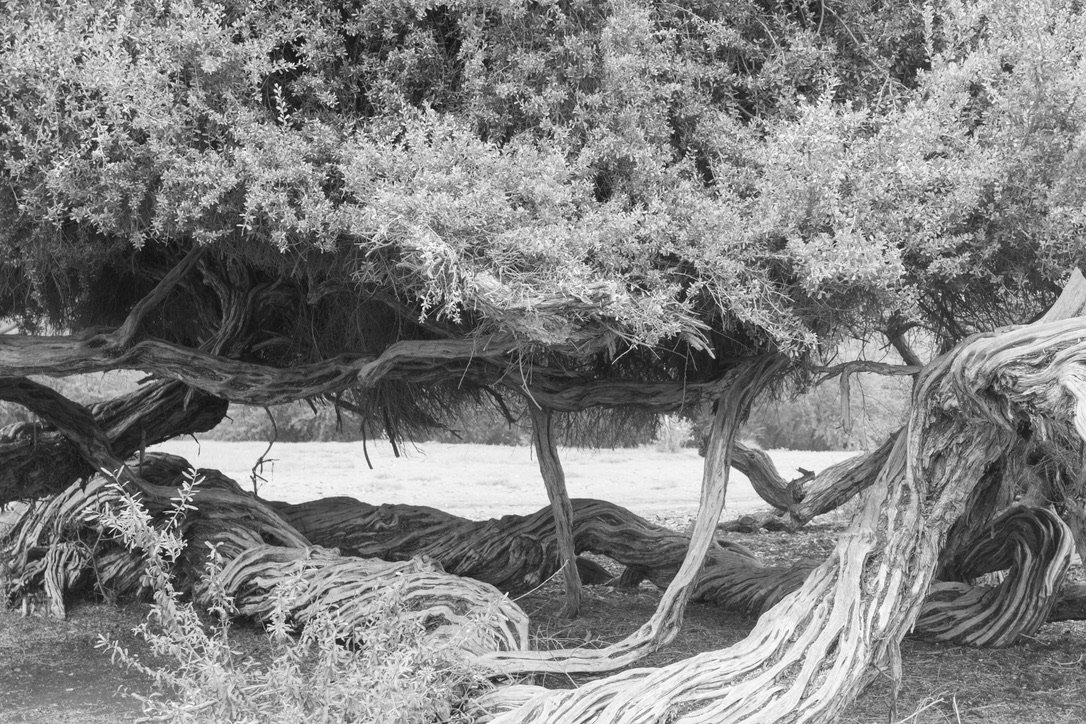 Black and white photo of a large, twisted, gnarled tree with sprawling branches and dense foliage, with some roots visible in the foreground.