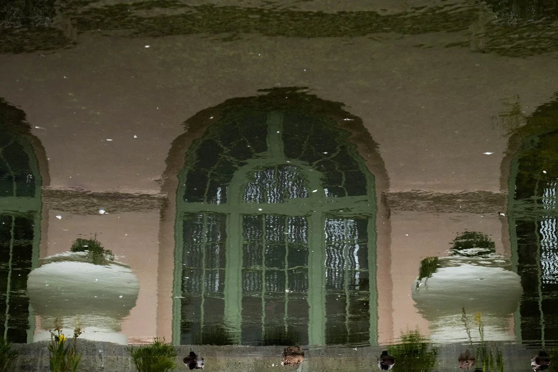 Reflection of arched windows on water with greenery and flowers at the edge