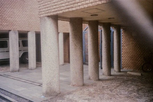 Concrete pillars supporting a brick building in an outdoor area.