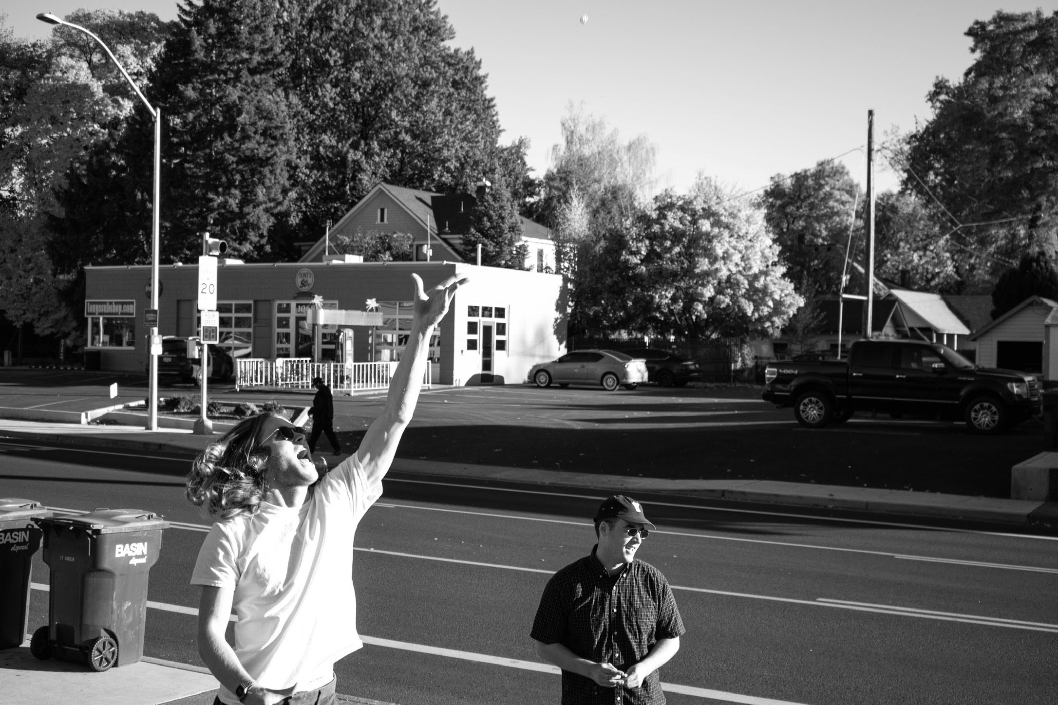 Two young men standing on a sidewalk at a crosswalk, one pointing upward, in a small town with parked cars, trees, houses, and a building in the background. Black and white photo.
