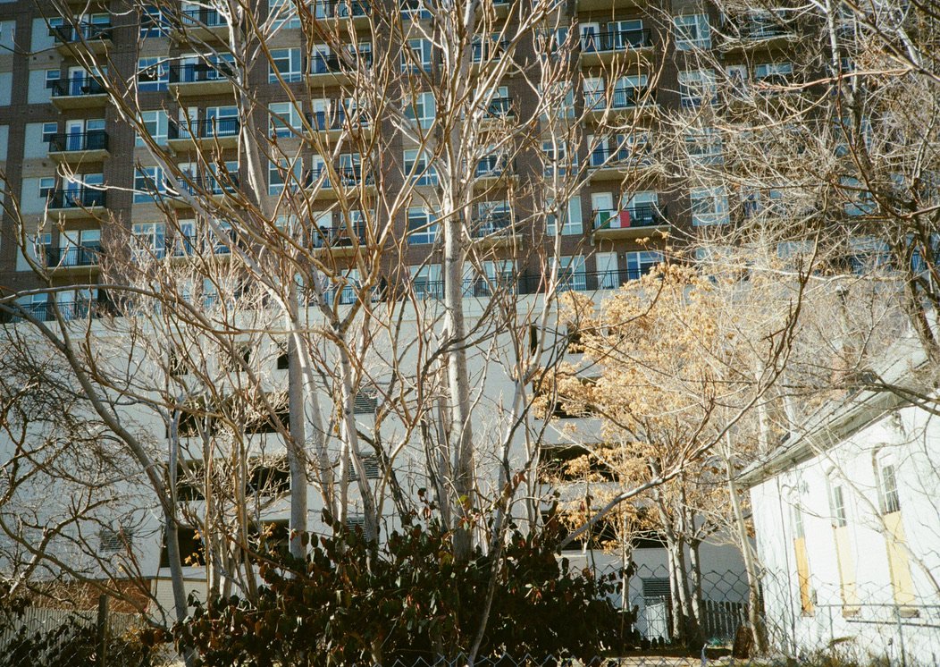 Apartment building with multiple balconies, trees with bare branches, and sunlight.