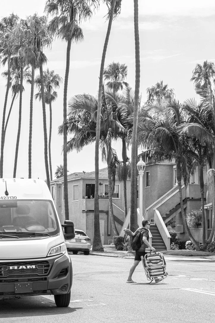 A man pushing a luggage cart across a street with palm trees and residential buildings in the background, black and white photo.
