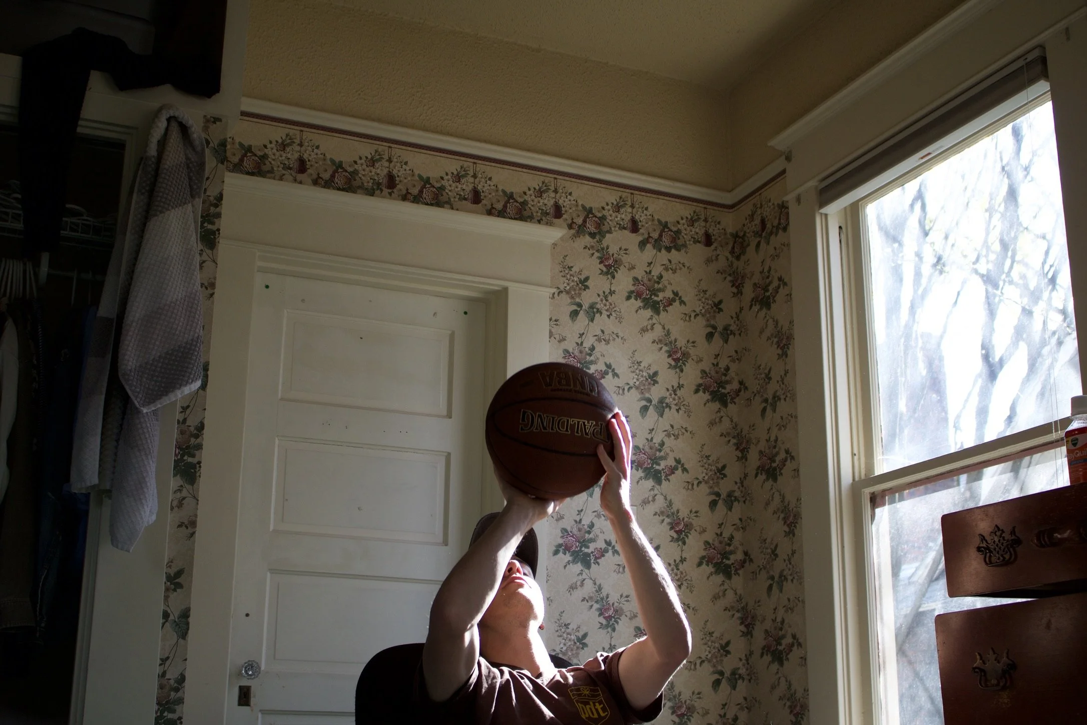 Person indoors holding a basketball up towards the ceiling, with sunlight coming through a window nearby.
