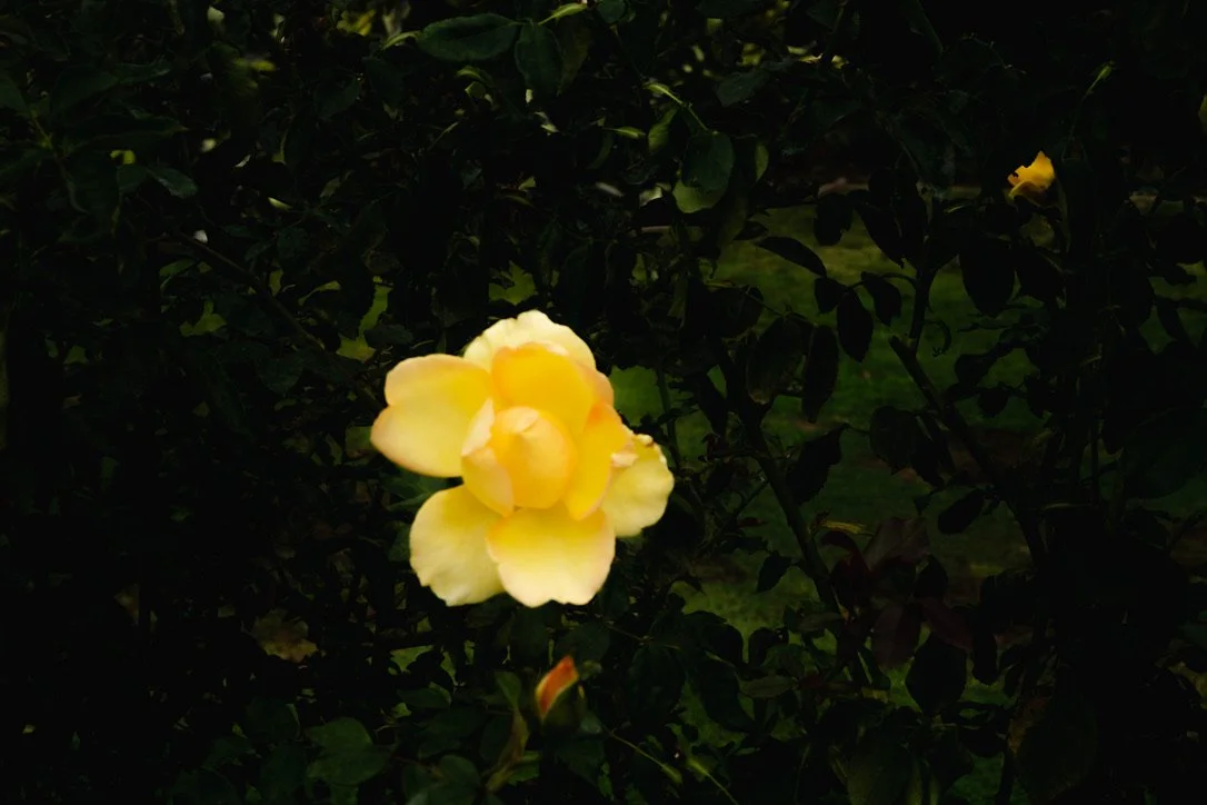A yellow flower blooming among dark green leaves.