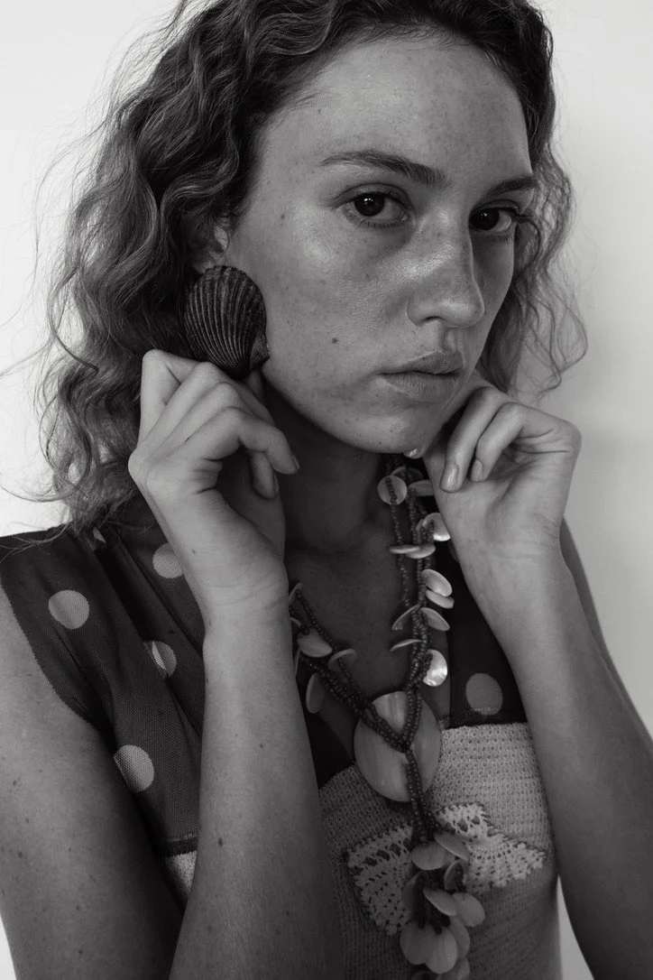 Black and white photo of a woman with wavy hair, holding a seashell to her ear with one hand and her other hand near her face. She wears a polka-dotted top and layered necklaces with shells and beads.