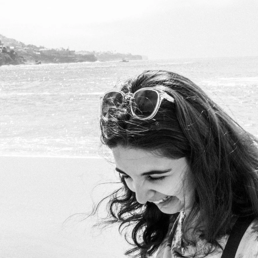 A young woman with dark wavy hair and sunglasses on her head, smiling and looking down at the beach, with ocean waves and distant land in the background.