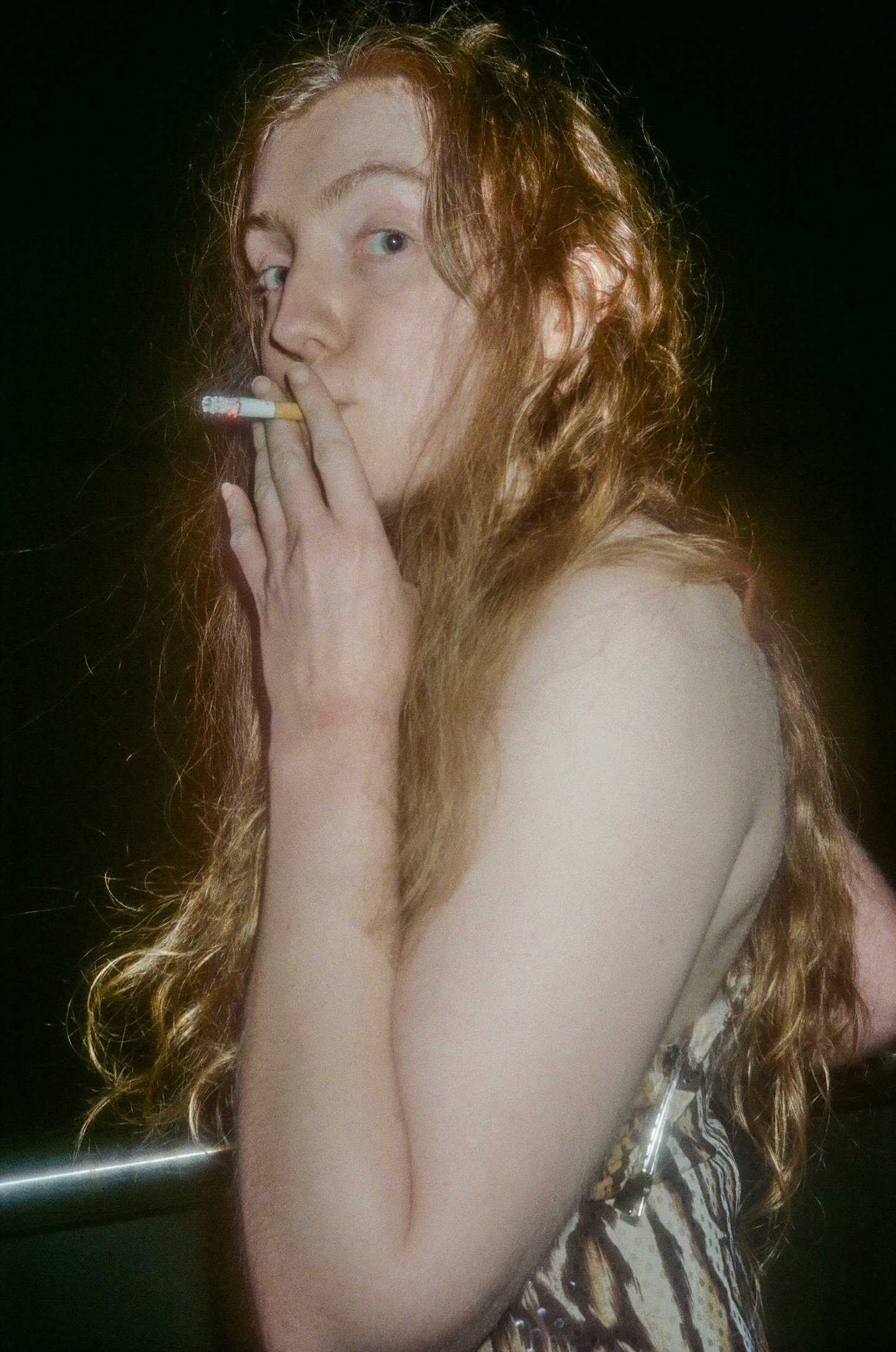 A young woman with long red hair holding a cigarette near her mouth, looking sideways with a serious expression, against a black background.