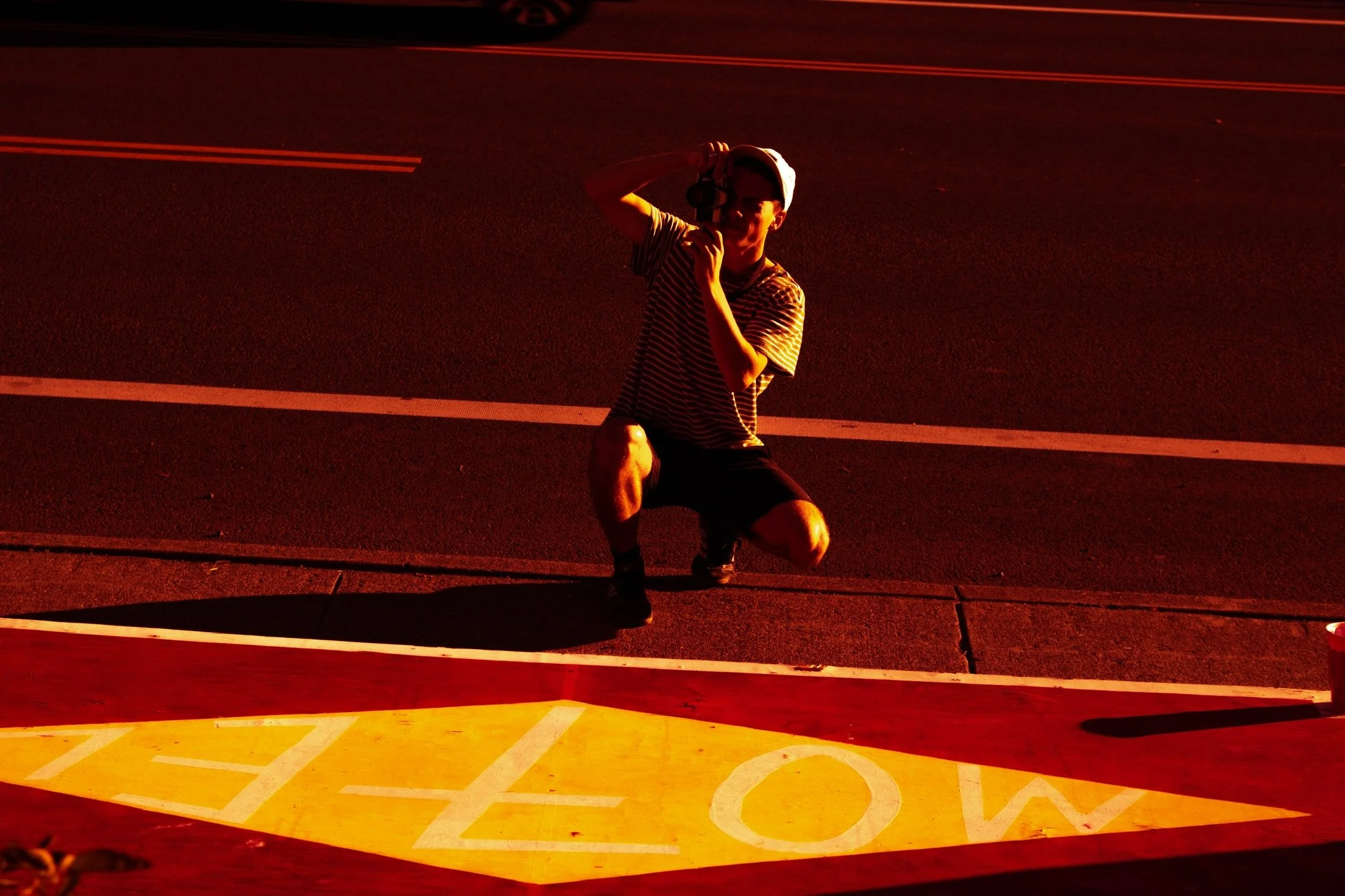 Person kneeling on a street at night, taking a photo or video, illuminated by a red-orange light, with a large painted marking on the street that includes the word 'ZONE'.