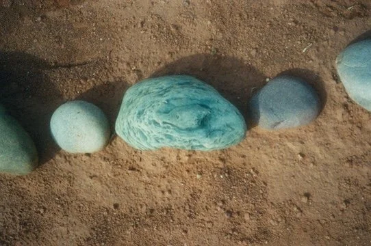Five smooth, rounded stones of various sizes and shades of blue-green, arranged in a line on a sandy surface.