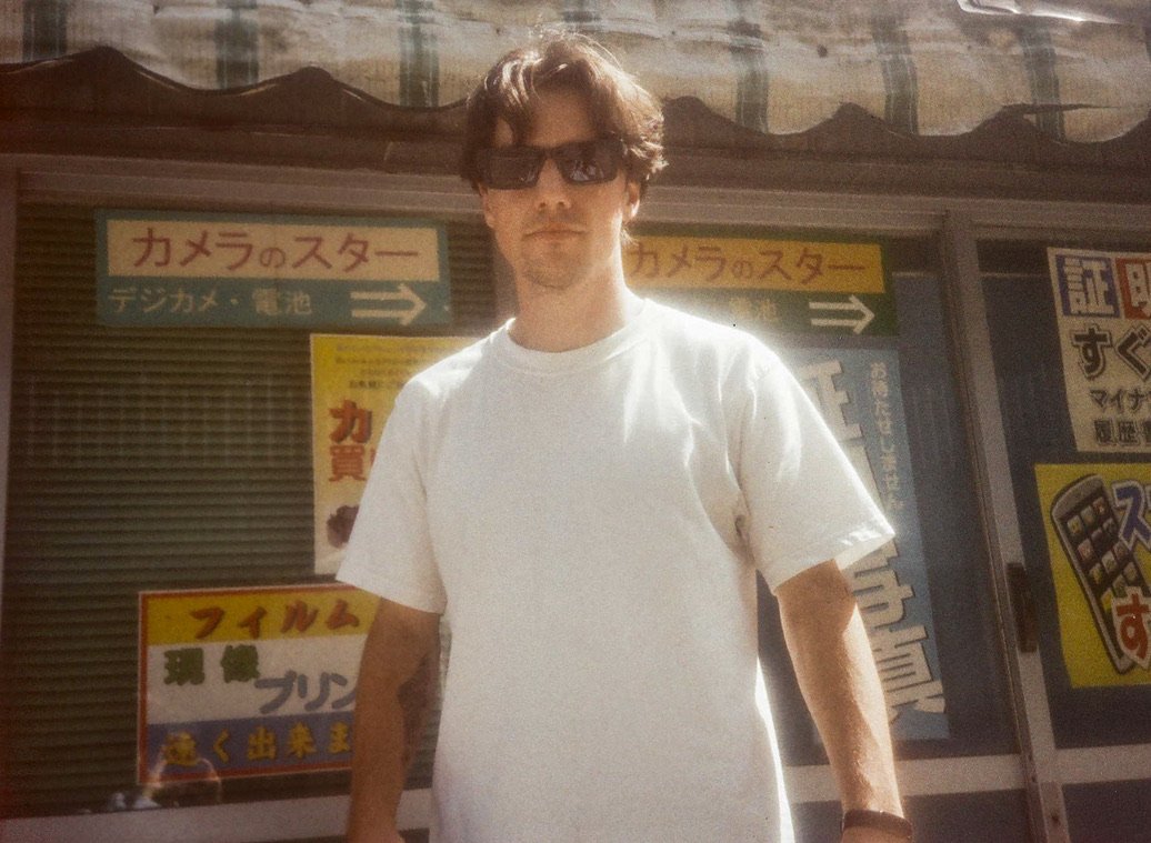 A man with wavy brown hair wearing black sunglasses and a plain white t-shirt standing outside a building with Japanese signage.