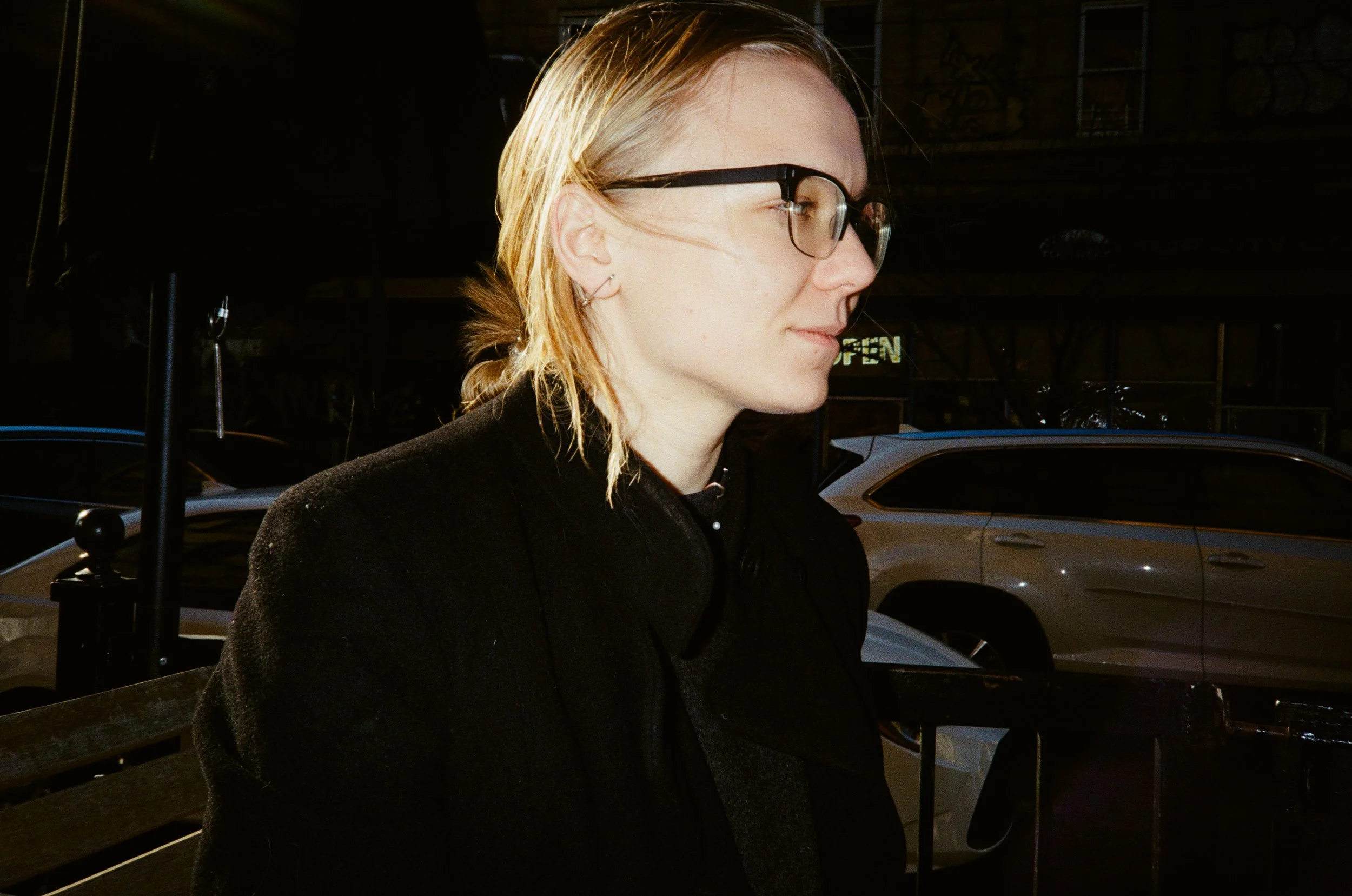 A profile view of a woman with blonde hair, wearing glasses and black clothing, sitting outdoors at a bench with cars in the background during daytime.