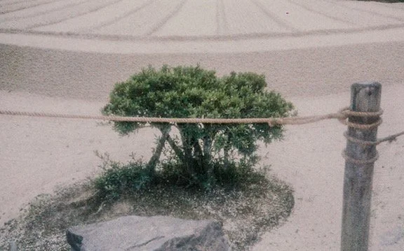 A small green shrub surrounded by sand, with a wooden post on the right and a cord tied to it, used as a barrier.
