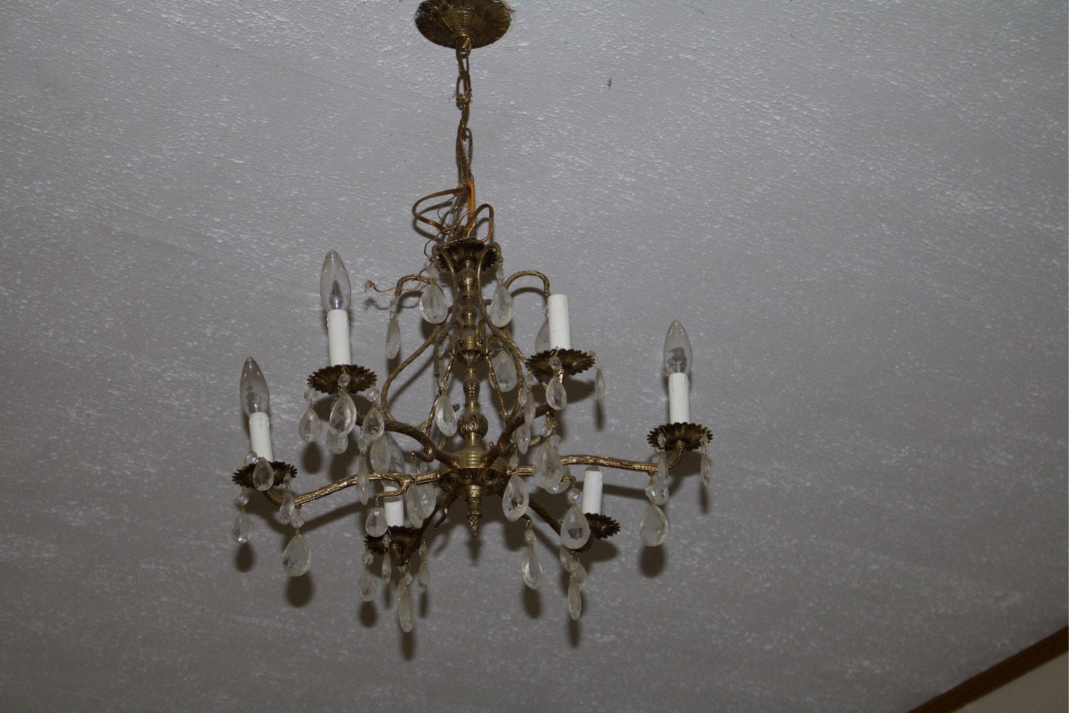 An ornate vintage chandelier with multiple arms, candle-shaped light bulbs, and crystal decorations hanging from a textured ceiling.