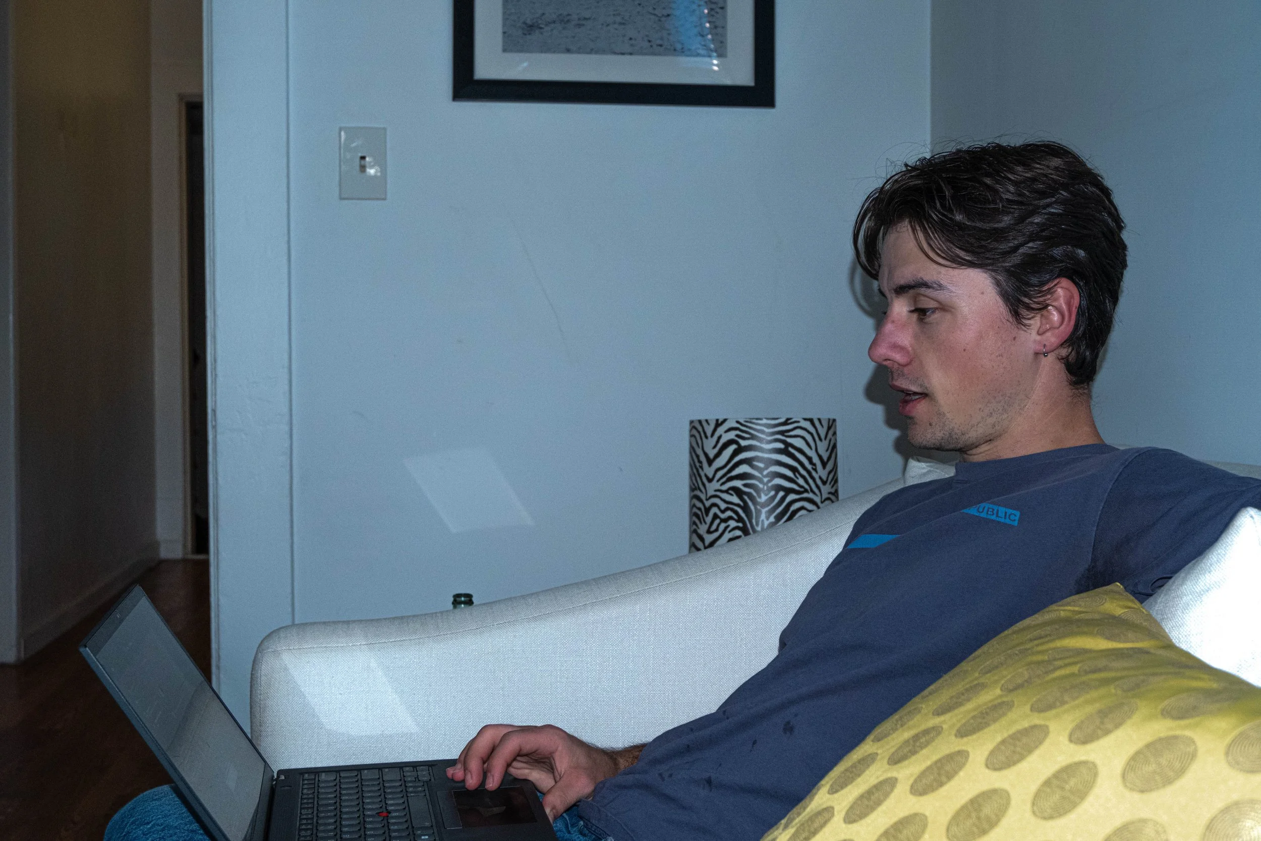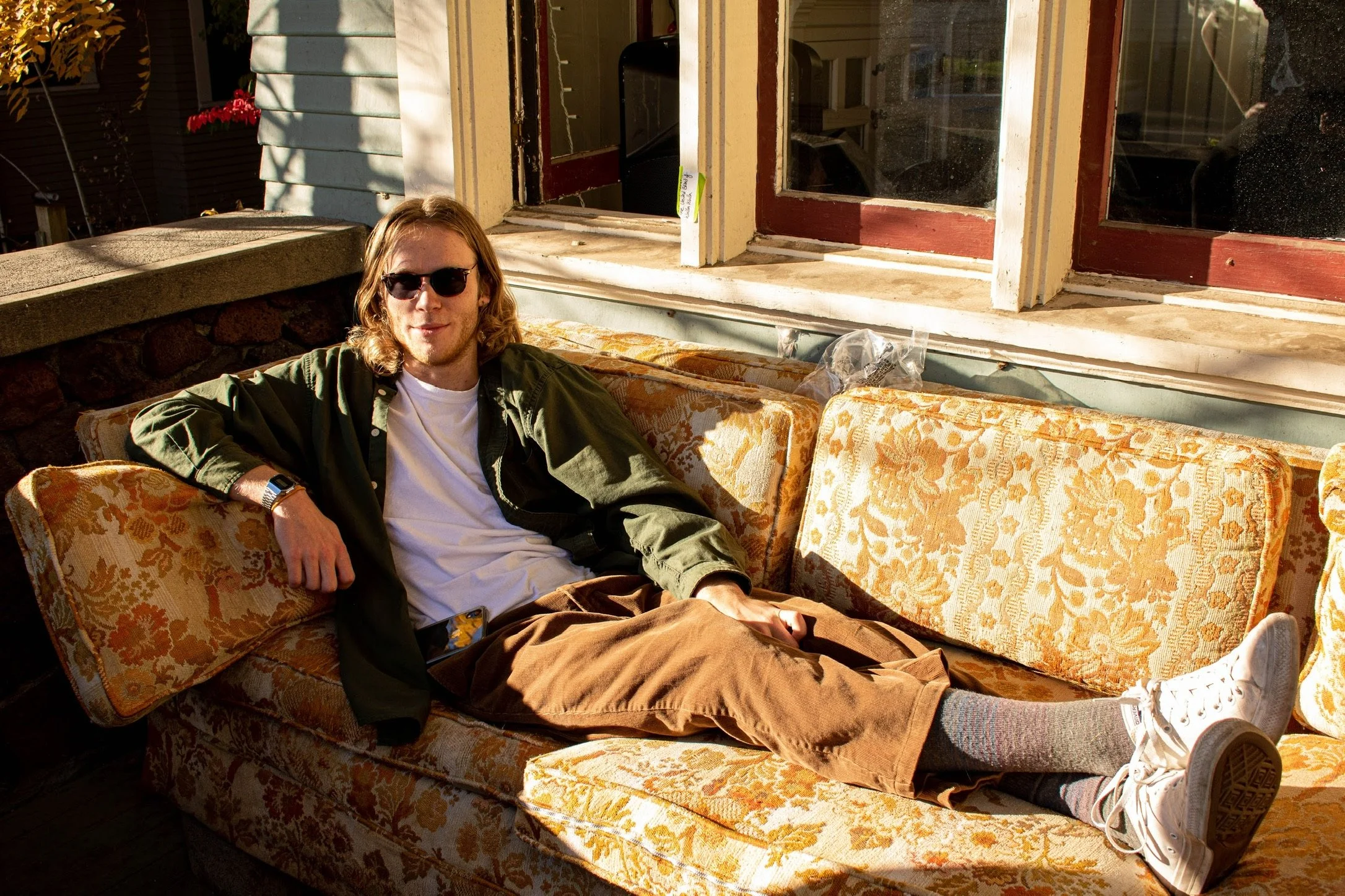 Young man with long hair wearing sunglasses, green shirt, white t-shirt, brown pants, and white sneakers, sitting and relaxing on a vintage floral sofa in the sunlight near a window.