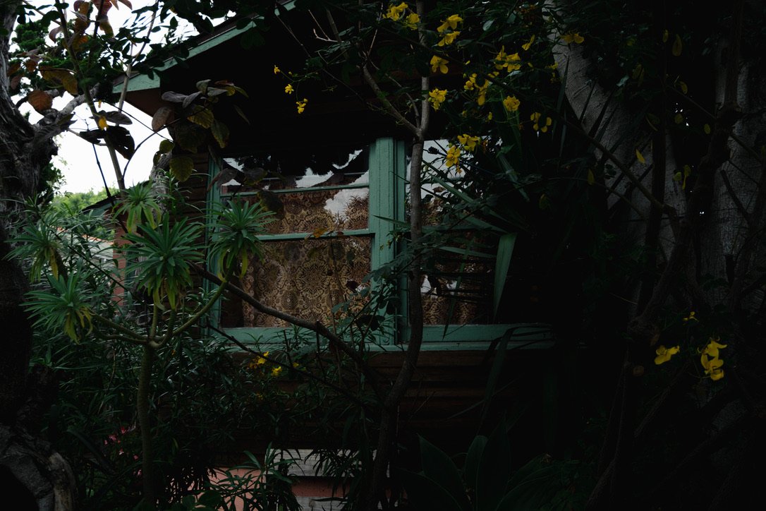 A treehouse with teal window frames, surrounded by dense green foliage and yellow flowering vines.