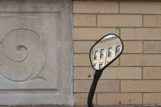 A magnifying glass leaning against a brick wall, reflecting a building with multiple windows.