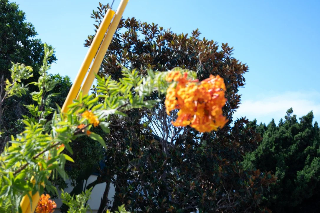 Blurred orange flower on a plant with green foliage, yellow support poles, and a blue sky background.
