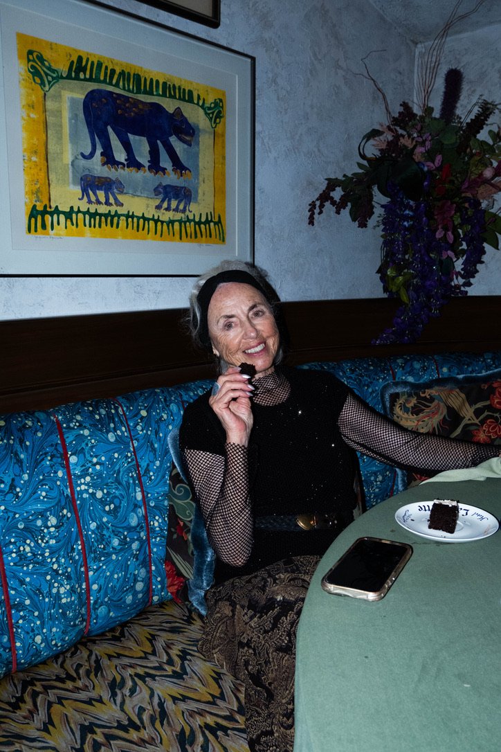 An elderly woman sitting at a dining table, holding a piece of chocolate cake, smiling, with a smartphone on the table, and a framed artwork of a tiger on the wall behind her.