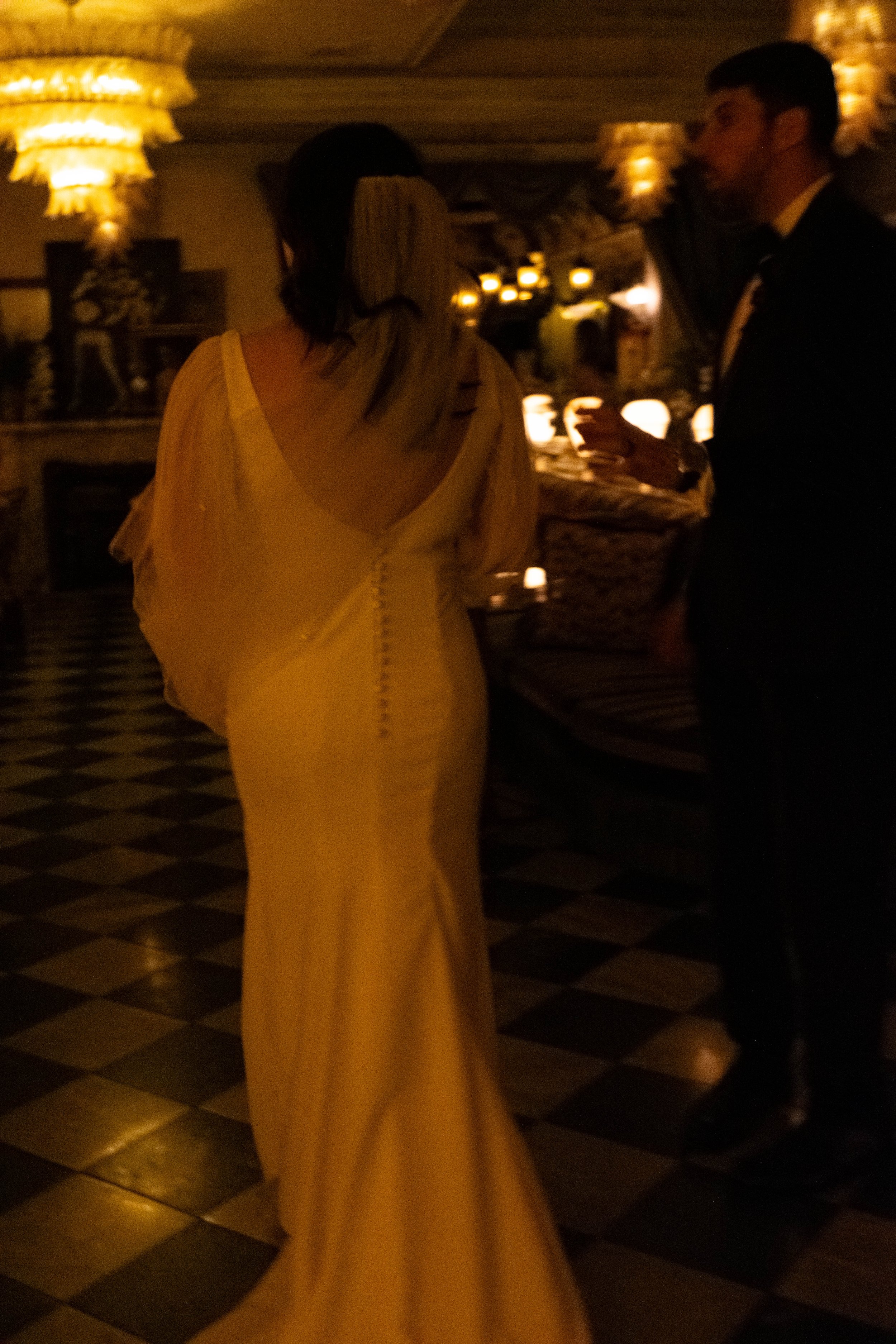 A woman in a long yellow gown and a man in a dark suit having a conversation in a dimly lit, elegant room with warm lighting and a checkered floor.