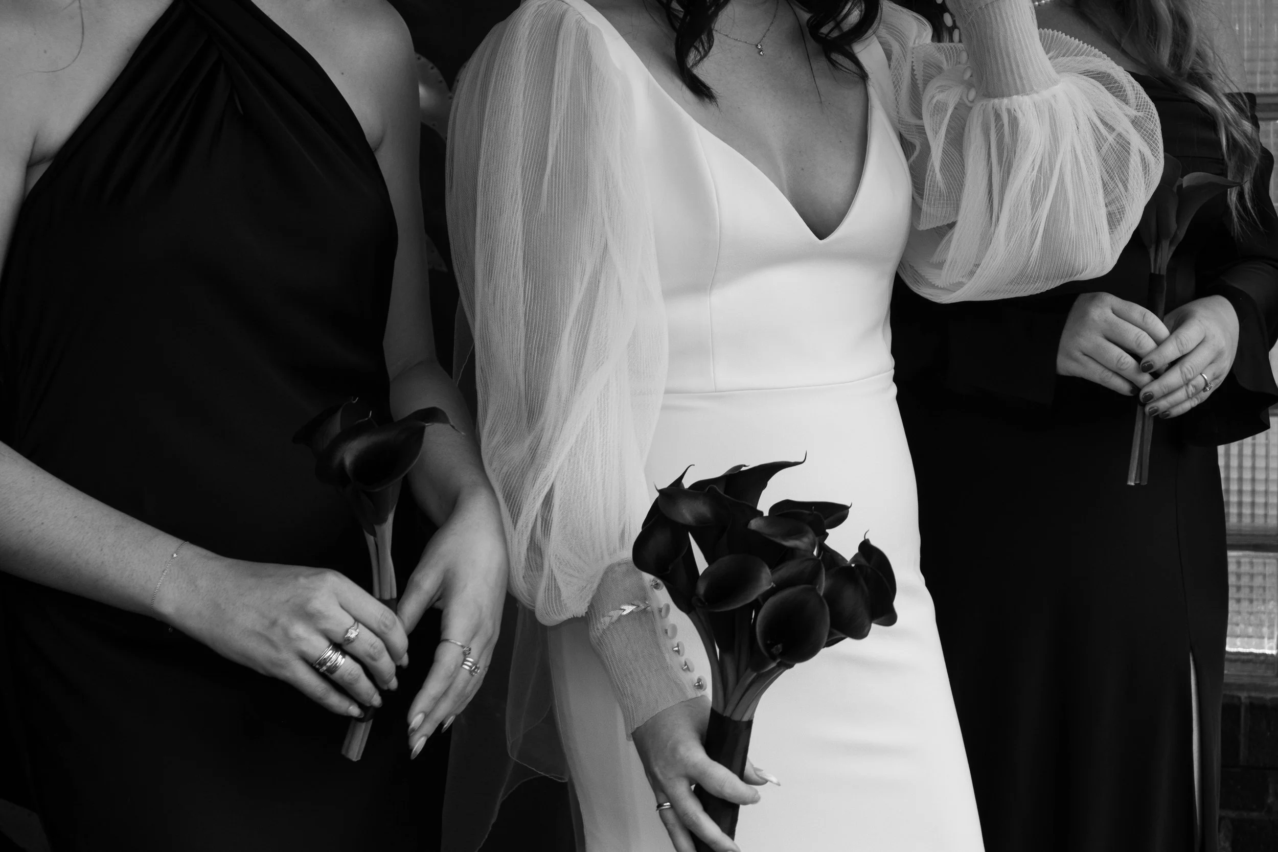 Close-up of three women in dresses holding dark calla lily flowers, focusing on their torsos and hands.