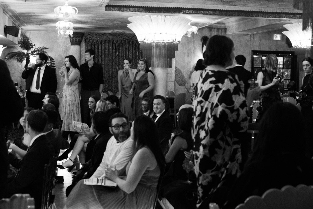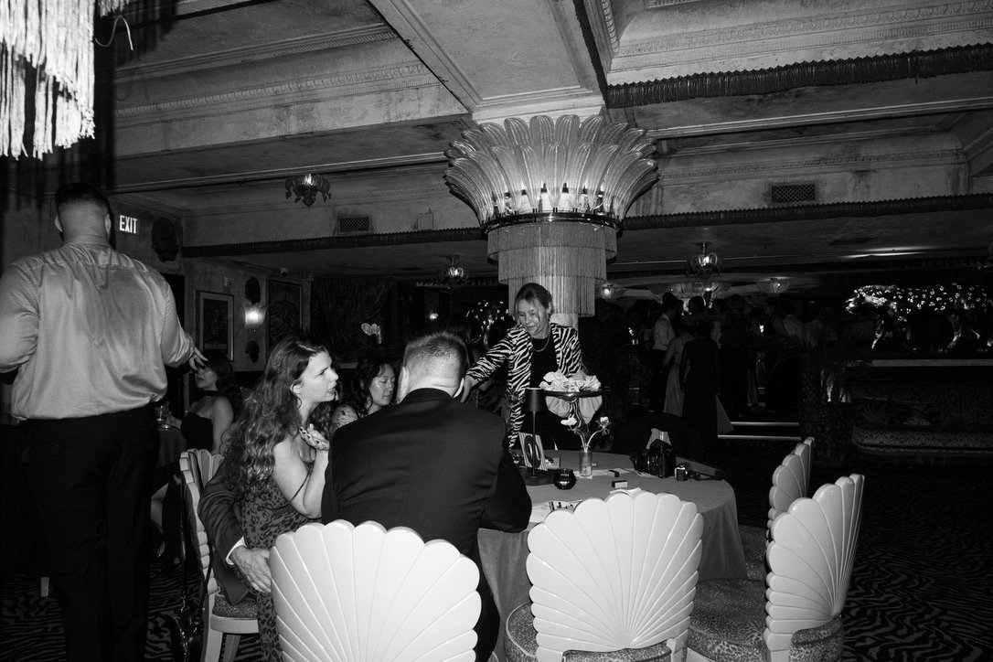 People at a formal event in a decorated room, some standing and some seated, with elegant lighting and decor.