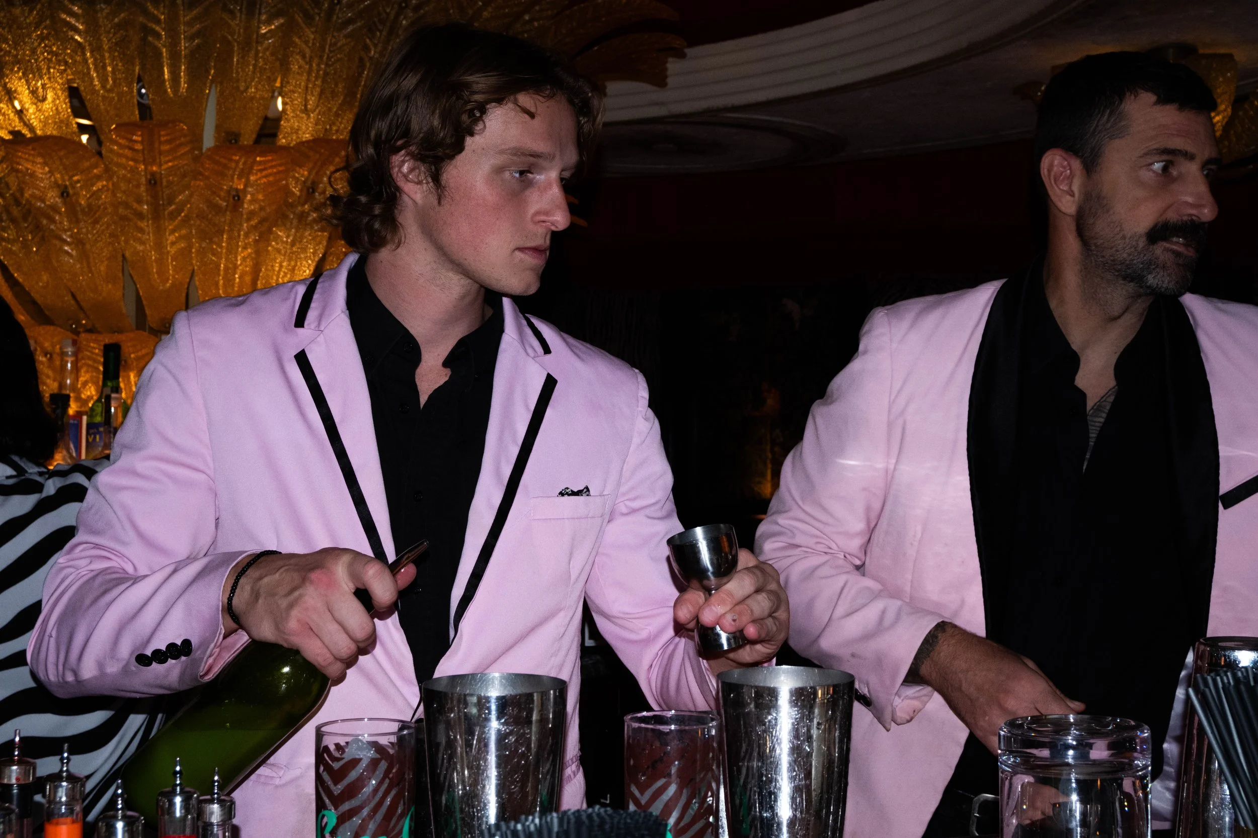 Two bartenders in pink jackets behind a bar, one holding a bottle and a jigger, others with bar tools, in a dimly lit setting with decorative lights.