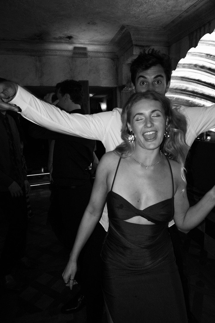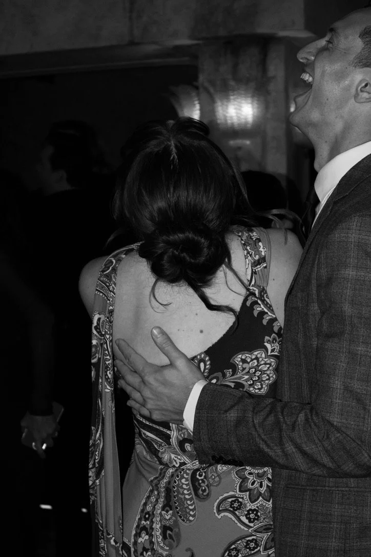 A man and woman are dancing at a celebration, the man wearing a suit and the woman in a patterned dress, both laughing and enjoying the moment.