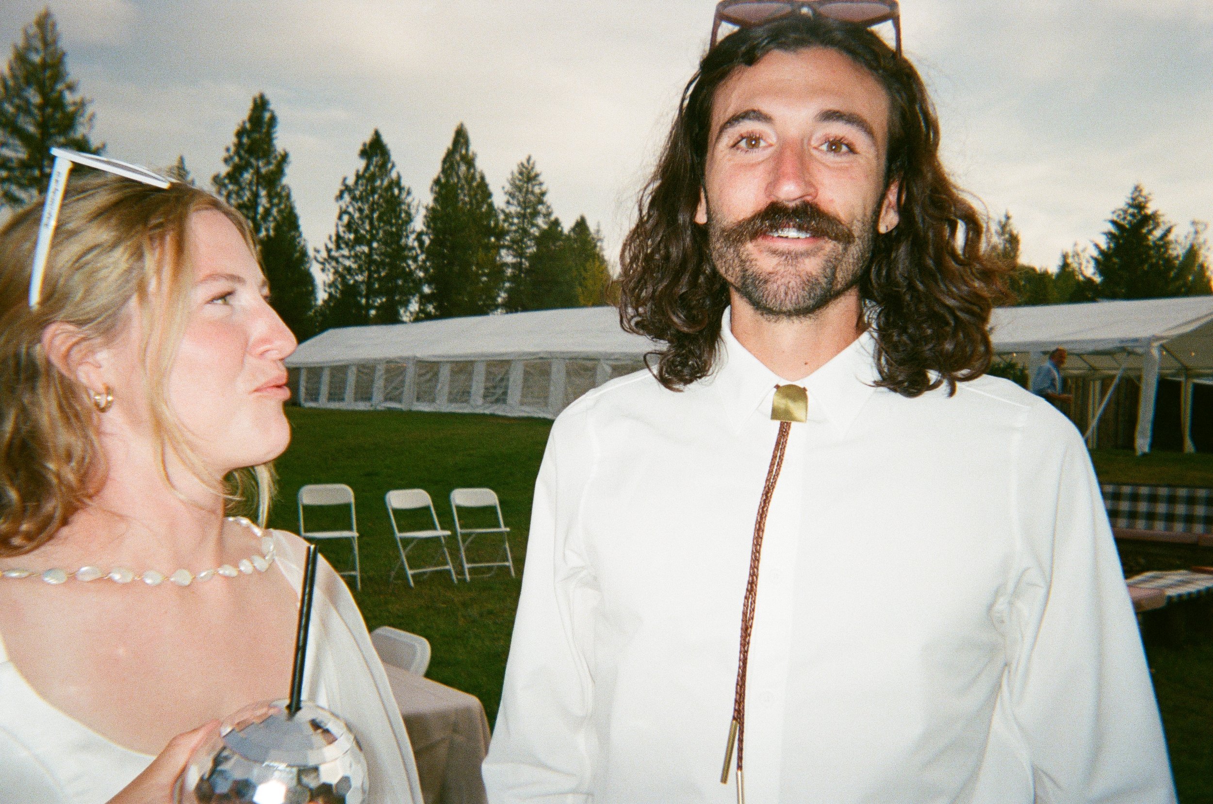 Two people at an outdoor event, with tents and chairs in the background. The woman on the left holds a drink with a straw and wears a shell necklace, while the man on the right has long wavy hair, a beard, and wears a white shirt with a bolo tie.