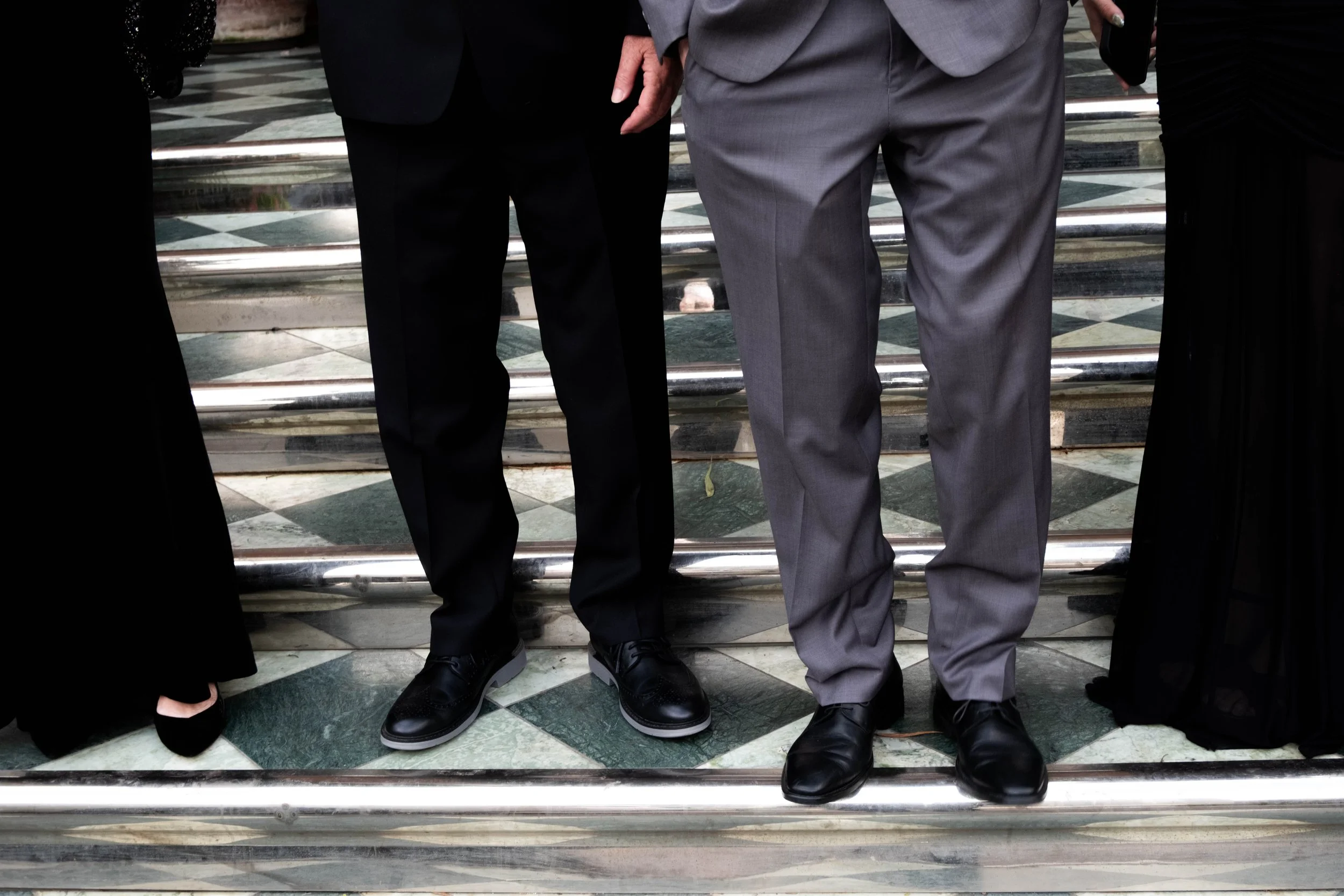 Close-up of men's legs and feet wearing formal black and gray suits and shoes, standing on a patterned floor in front of steps.