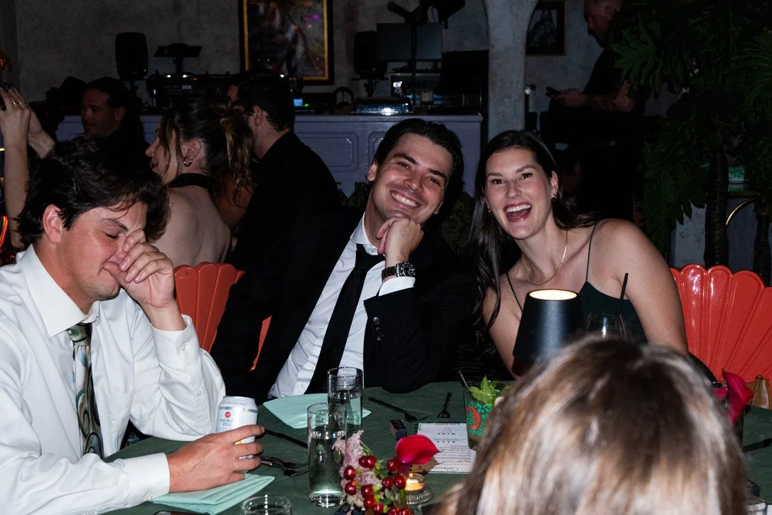 A group of people sitting at a dinner table during a social event, with some smiling and others engaged in conversation.