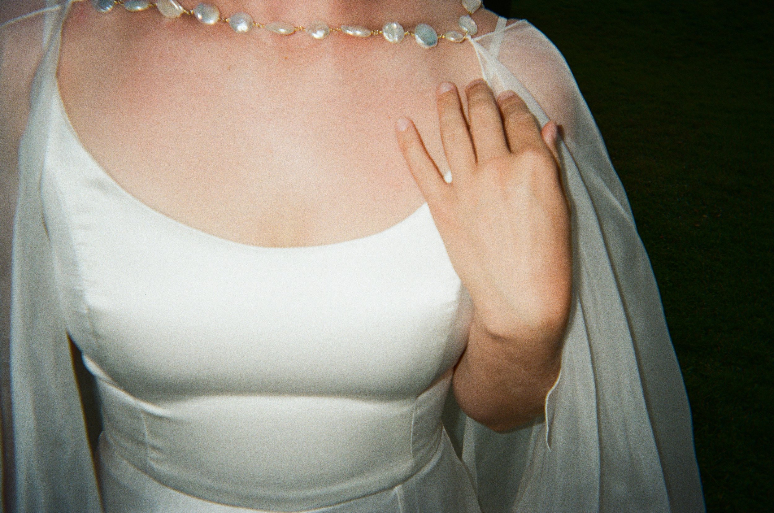 Close-up of a woman wearing a white dress with a sheer overlay and a string of large pearl necklace, touching her shoulder with her right hand.