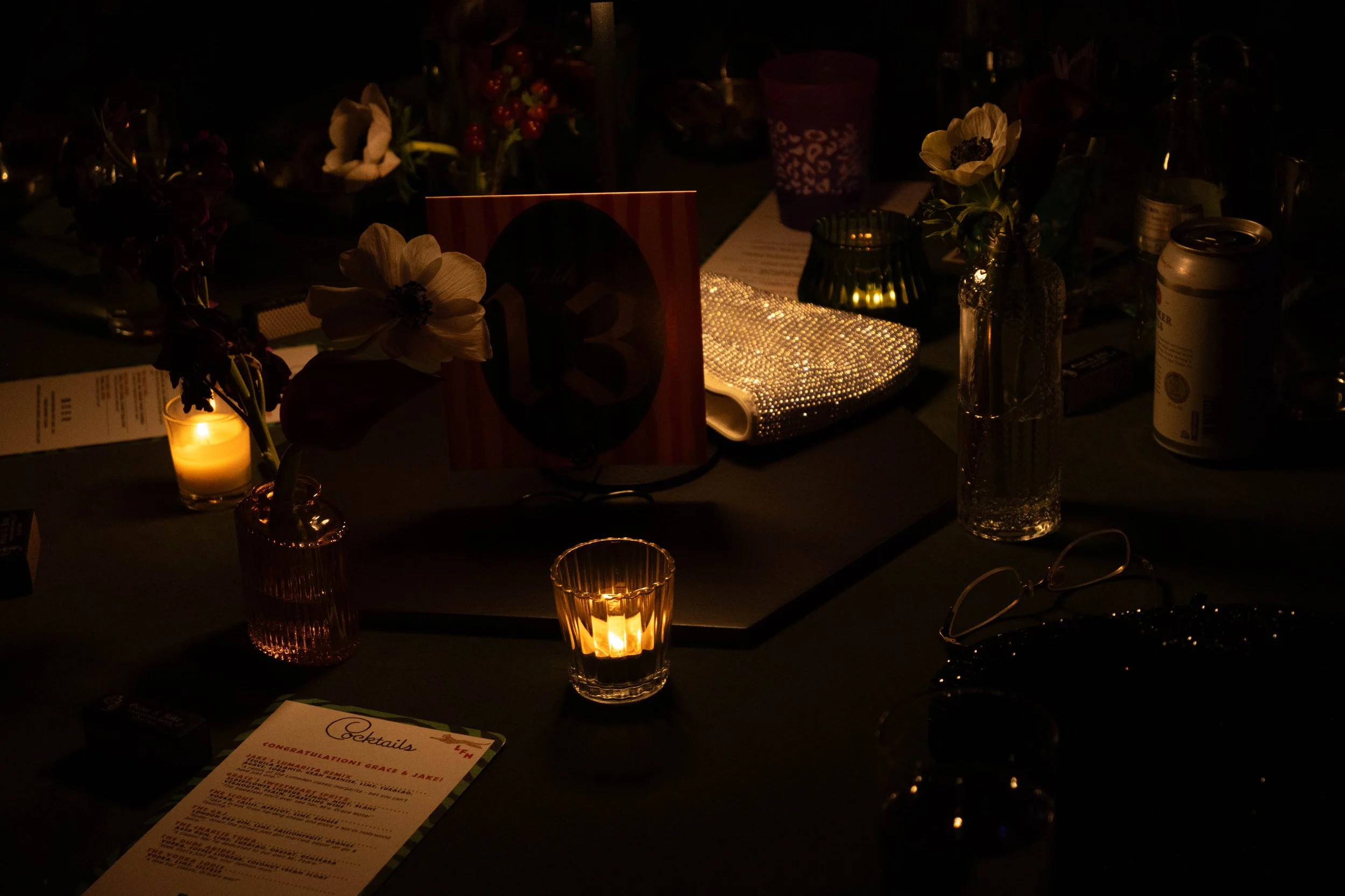 A dimly lit table with candles, flowers in vases, and various items including a menu, glasses, and snacks at an event or celebration.