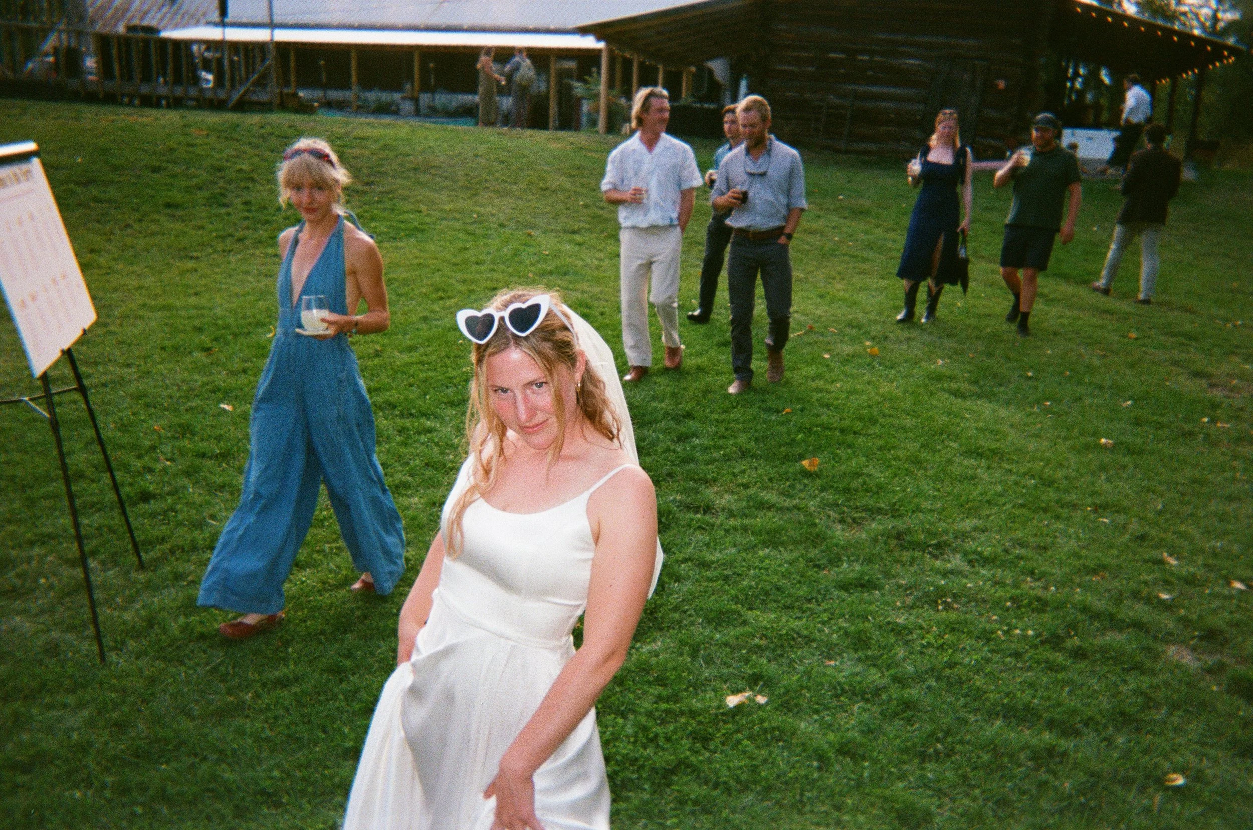 A young woman in a white dress with heart-shaped sunglasses posing outside at a gathering, with several people in the background on a grassy area near a wooden building.