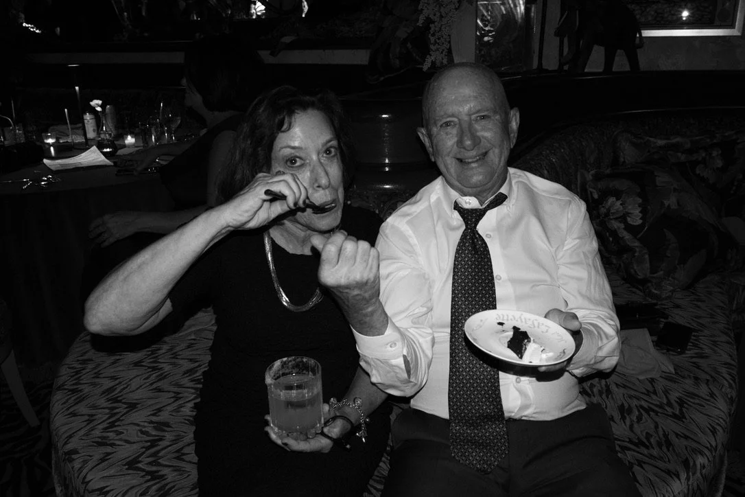 An elderly man and woman sitting on a patterned couch at a restaurant, smiling at the camera, with the woman holding a drink and the man holding a plate with a piece of cake.