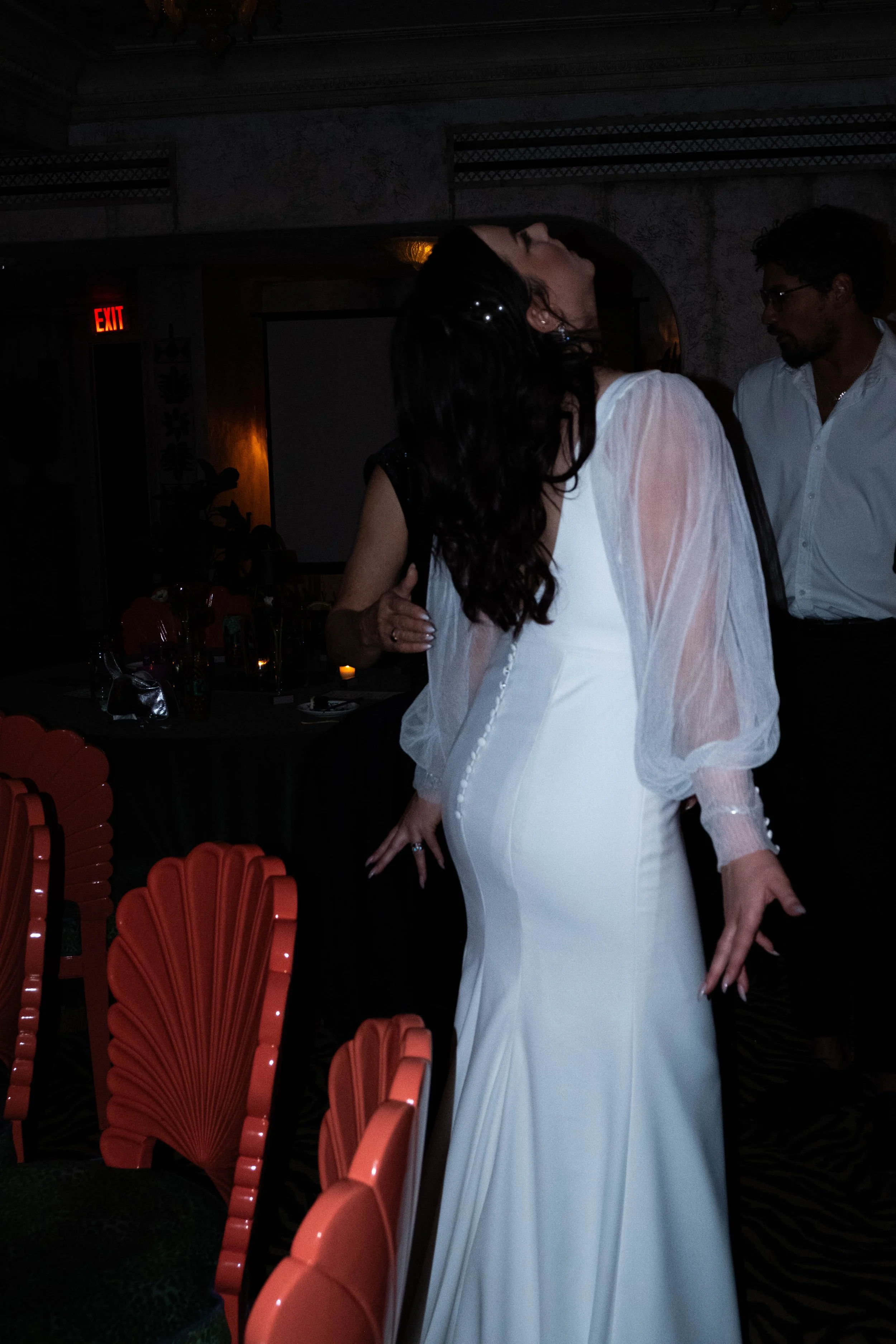 Woman in a white dress dancing at a dark indoor event with red chairs and other people in the background.