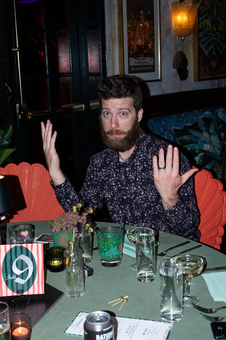 A man with a beard and dark curly hair, wearing a dark patterned shirt, sits at a table in a dimly lit restaurant or bar. He has both hands raised with palms open, looking directly at the camera. The table has several glasses of water, a glass of whi