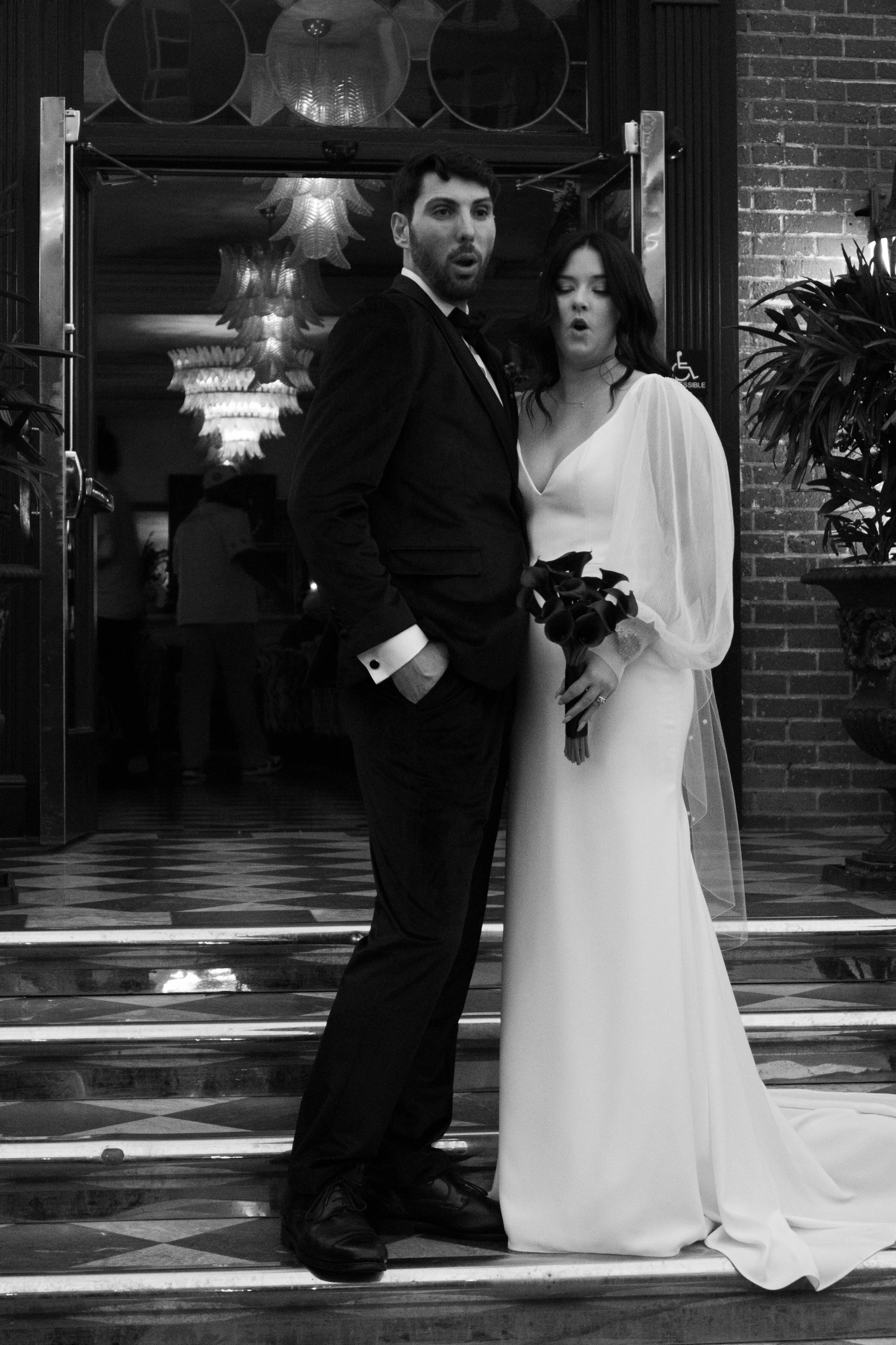 A bride and groom in wedding attire standing on a staircase, with the groom in a tuxedo and the bride in a white wedding dress holding a bouquet of calla lilies.