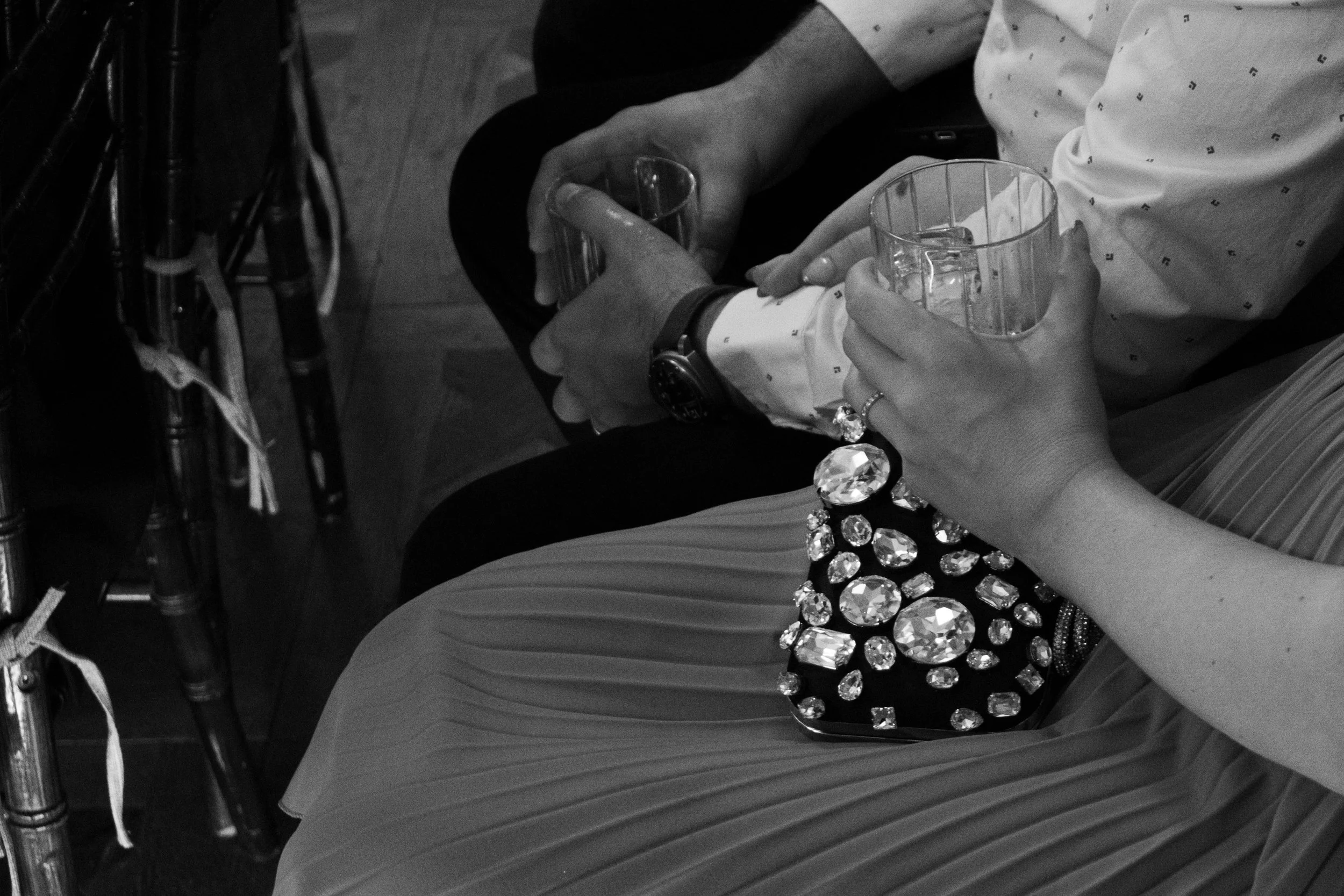 Close-up of a woman holding a glass of water, showing her hand with a ring and a bracelet. She sits next to a man, who is also holding a glass. The woman has a clutch with large rhinestones on her lap and is wearing a pleated skirt. The couple appear