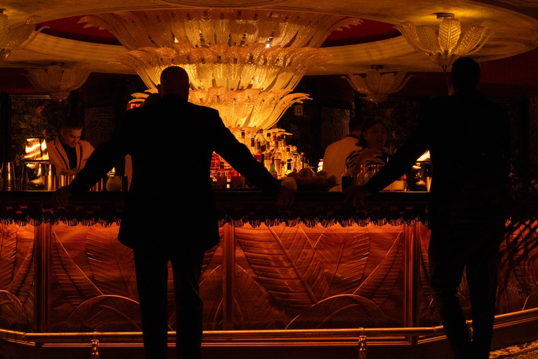 Silhouettes of two men in suits standing at a dimly lit bar with an illuminated decorative fountain or sculpture in the background, and bartenders serving drinks.