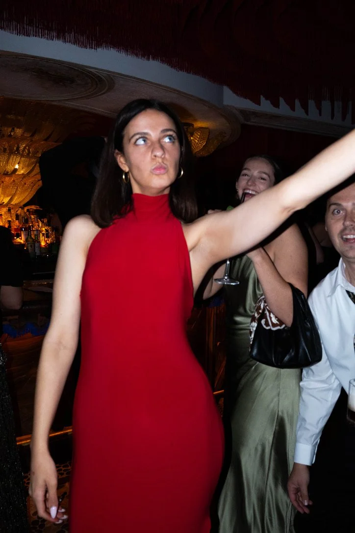 Woman in a red sleeveless dress taking a selfie with several smiling friends in a dimly lit bar or lounge.