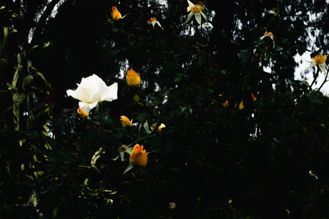 A dark bush with white and yellow flowers blooming, some flowers partially closed.