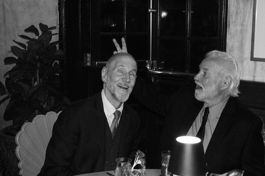 Two older men in suits sharing a laugh at a dinner table, one with a beard and the other with long hair, in a dimly lit restaurant setting.