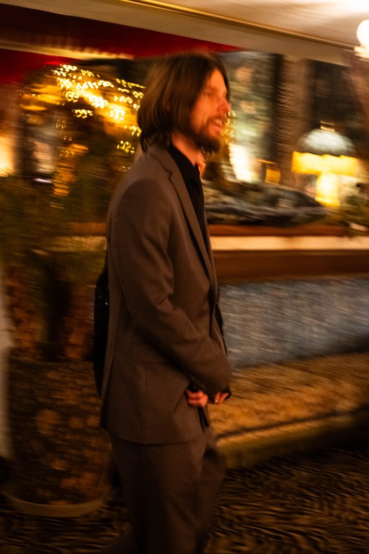 A man with long hair and a beard wearing a dark suit standing indoors, smiling, with blurred warm lighting and decorations in the background.
